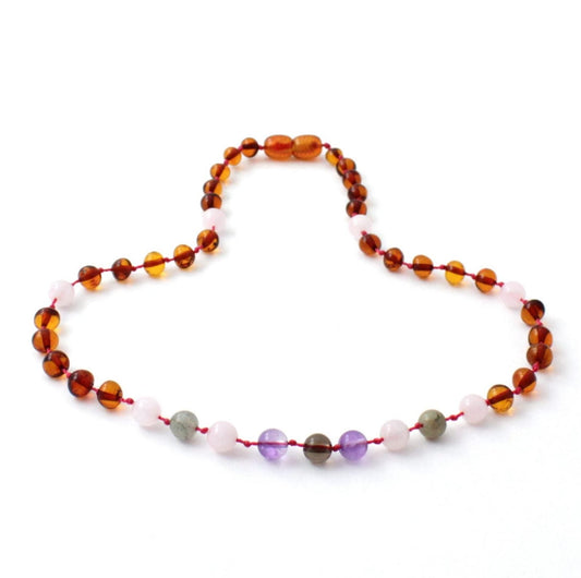 Amber Necklace Cognac, Rose Quartz, Smoky Quartz, Labradorite and Amethyst | Baby 32cm